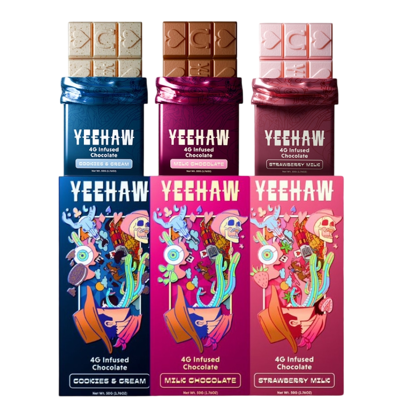 The YEEHAW Mushroom Infused Chocolate Bar 4g is a premium nootropic chocolate crafted for focus, creativity, and elevated mood. Each bar blends rich chocolate with a functional mix of cordyceps, kanna, kava, L-theanine, mucuna, citicoline, theobromine, and piperine—delivering a smooth, controlled experience without psilocybin. Available in Milk Chocolate, Cookies & Cream, and Strawberry Milk, it’s a flavorful way to support mental clarity and relaxed daytime vibes.